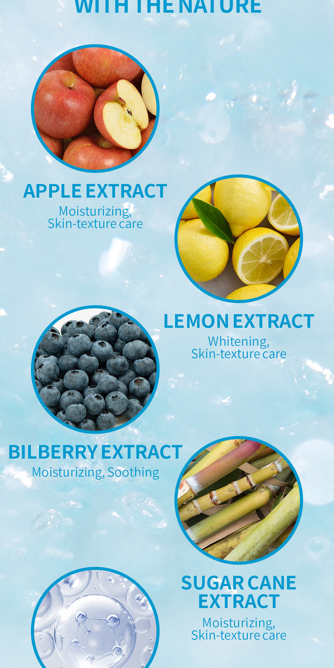 - 蘊含蘋果, 檸檬, 藍莓, 蔗糖提取物, 令肌膚保持濕潤和有光澤
